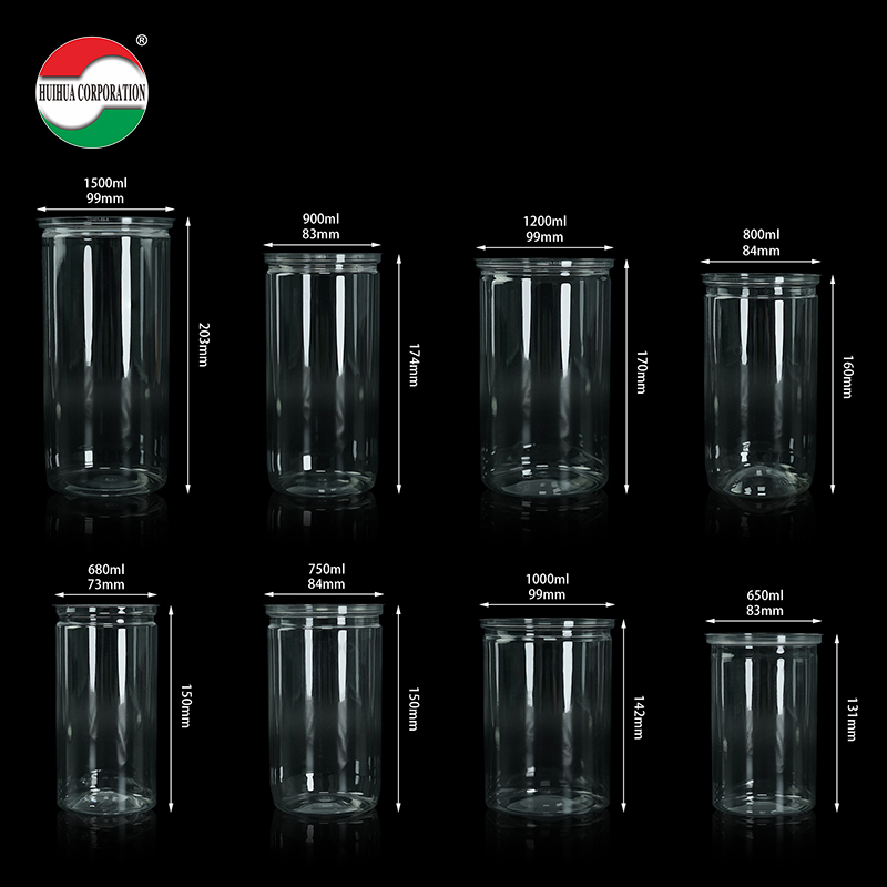 Διαφανή, άδεια, πλαστικά δοχεία κυλινδρικού σχήματος, τετράγωνα, κατάλληλα για τρόφιμα, πλαστικό βάζο PET με εύκολα ανοιγόμενα καπάκια PP για συσκευασία τροφίμων 1